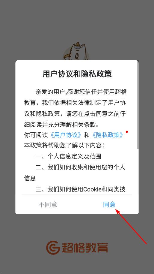 1、在用户协议和隐私政策弹窗中,点击同意,即可使用超格教育相关功能。