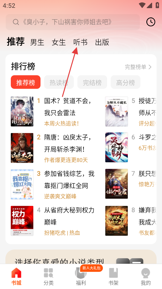 1、进入软件书城页面,点击顶部听书选项,切换到听书板块。