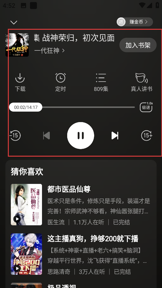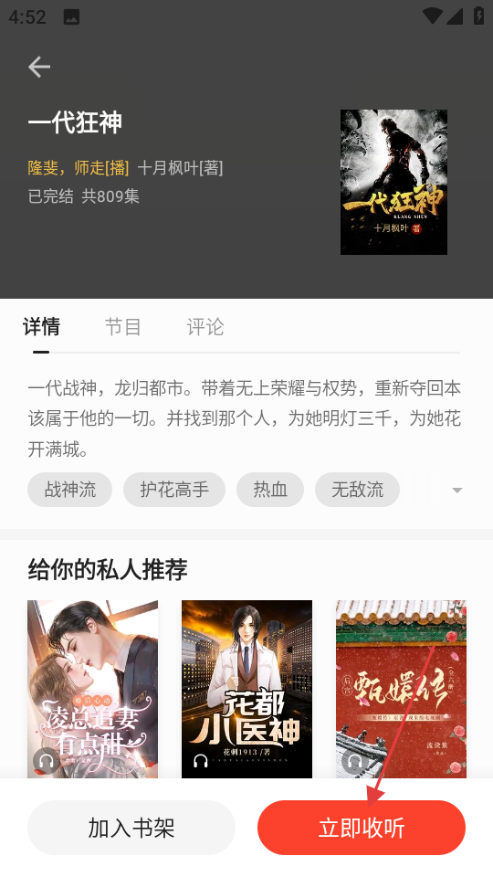 3、进入一代狂神详情页后,点击底部立即收听按钮,开始收听。