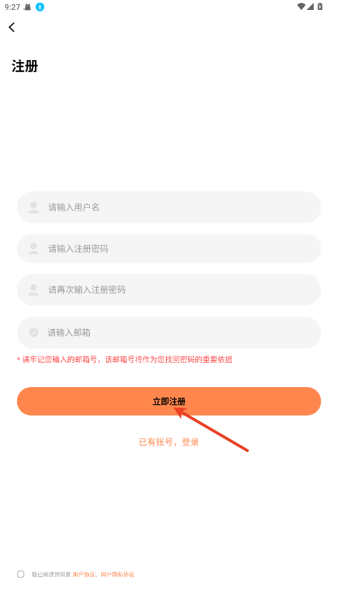 3.输入自定义用户名,密码和邮箱号,点击【立即注册】就可以了。