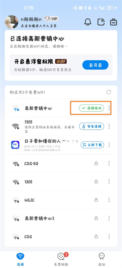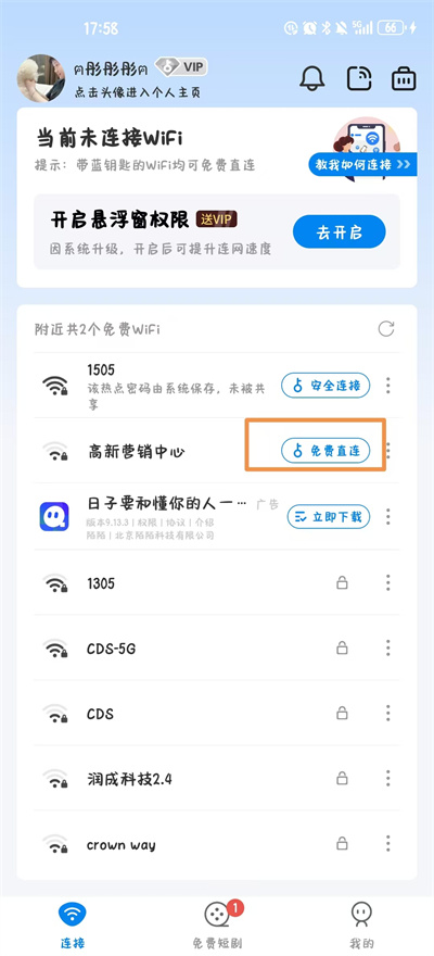 3、如果在WiFi旁边有一个钥匙的形状并有免费直连的字样,这就是可以进行WiFi的免费连接;