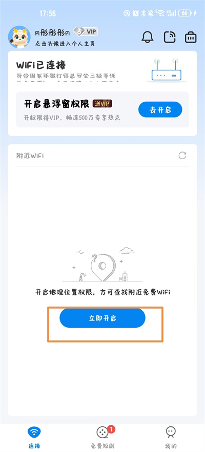 2、登录并进入软件后在首页可以看到需要开启位置权限,开启后将会定位当前的周围WiFi;