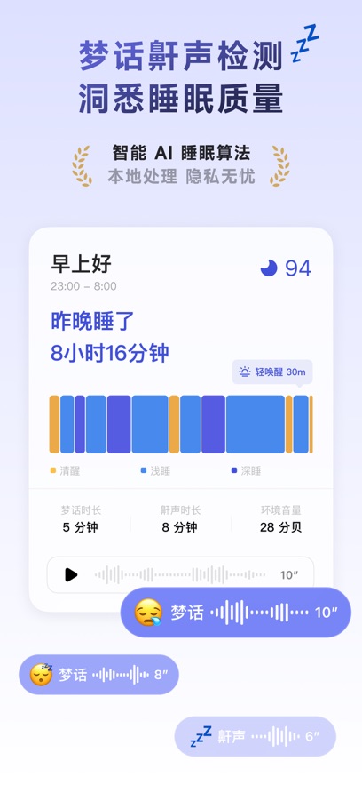 采用最新的机器学习技术,结合自研算法校准睡眠数据、判断睡眠区间、分析睡眠数据、识别记录梦话与鼾声,全面记录你的睡眠情况,生成专业的睡眠报告,从此轻松洞悉每晚睡眠。