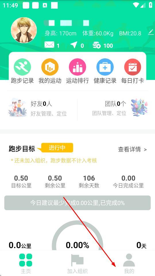 1、打开位动酷跑App,进入主界面后,点击底部导航栏中的我的选项。