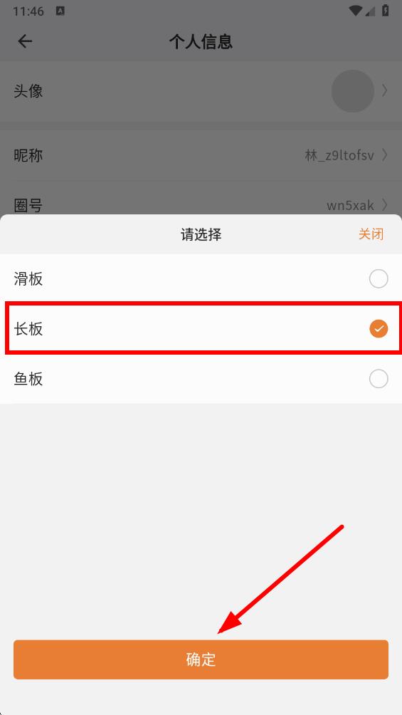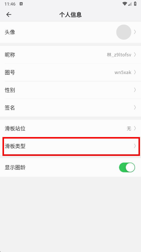 4、在个人信息页面中,点击滑板类型,进入选择滑板类型。