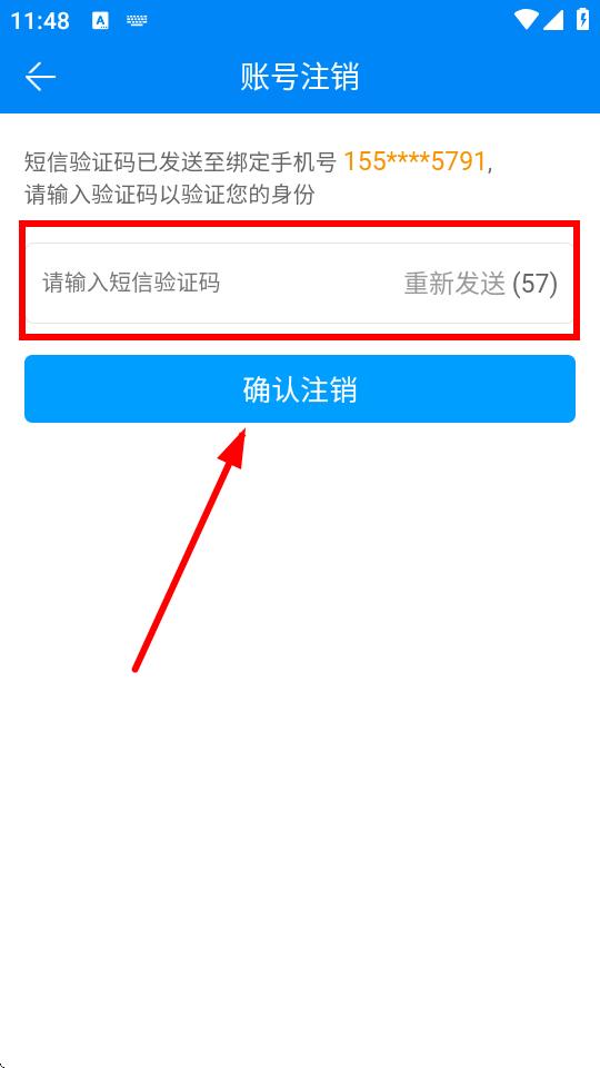 5、系统会发送验证码到绑定手机号,在对应输入框中输入收到的短信验证码,点击确认注销,完成账号注销。