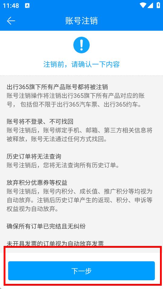 4、仔细阅读账号注销提示内容,确认后点击下一步。