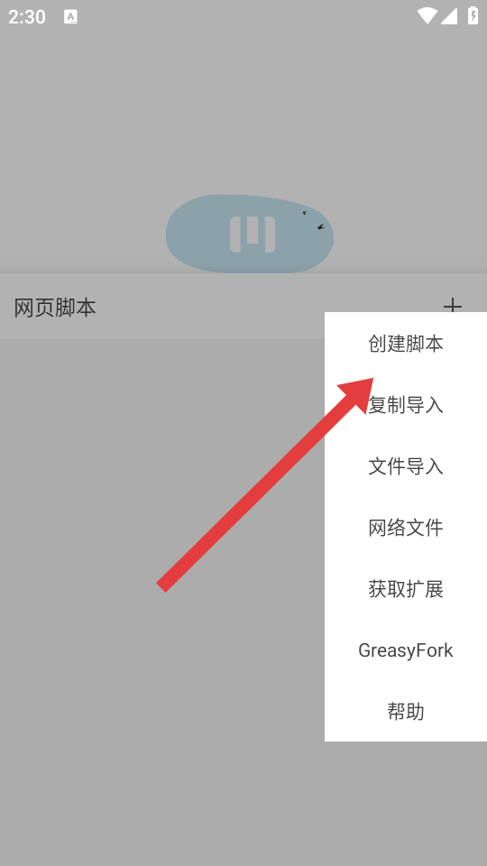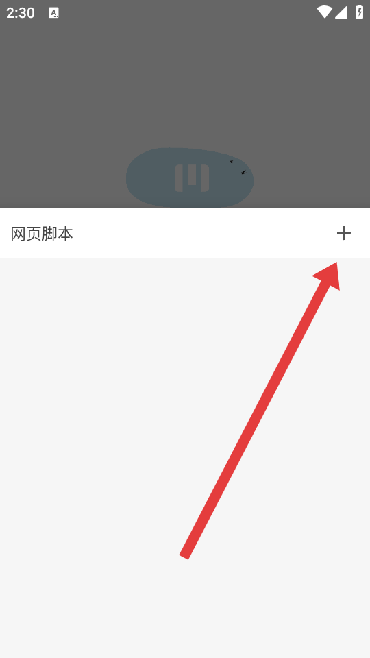 3、在网页脚本页面,点击右上角的+号按钮,弹出操作选项菜单。