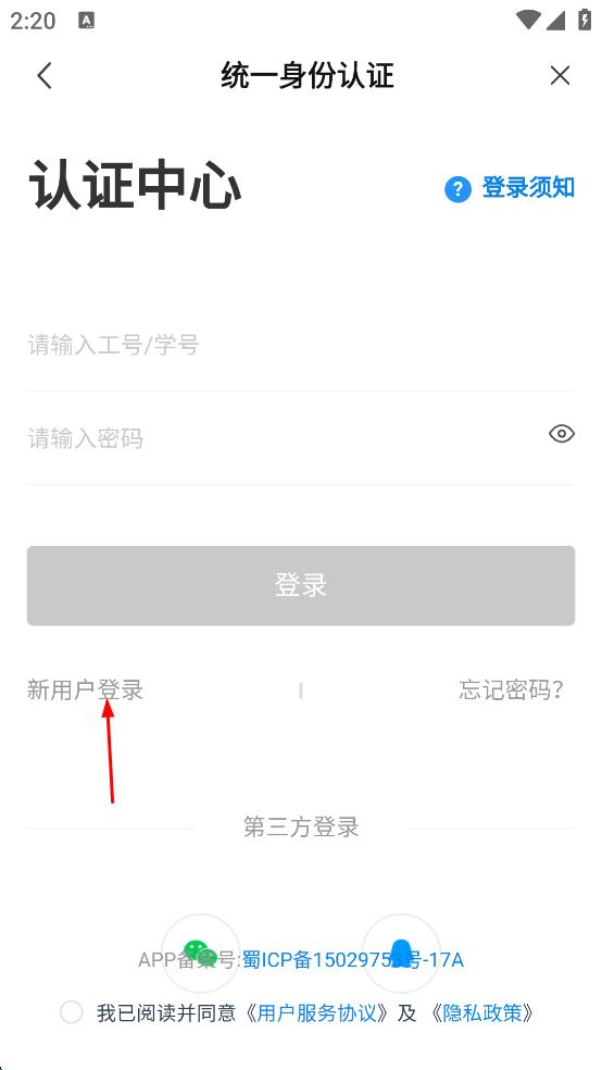 2、在统一身份认证页面,点击“新用户登录”选项,进入学校身份认证页面。