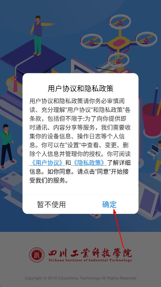 1、打开四川工业科技学院APP,进入用户协议和隐私政策页面,仔细阅读相关内容后,点击“确定”按钮,进入统一身份认证页面。