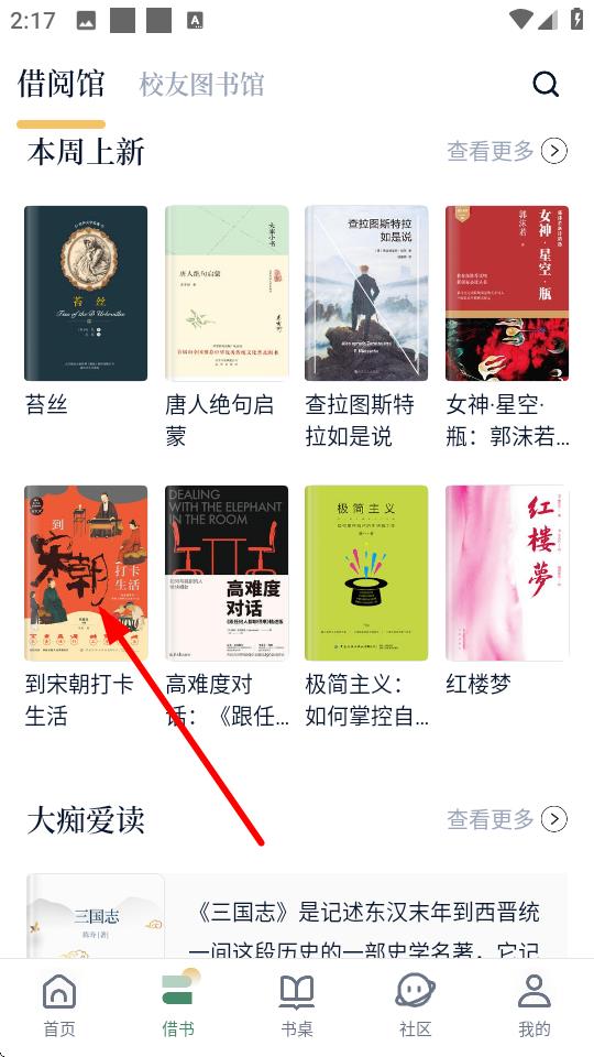 1、打开藏书馆app,点击底部导航栏的借书,在页面中选择想收听的书籍,如到宋朝打卡生活。