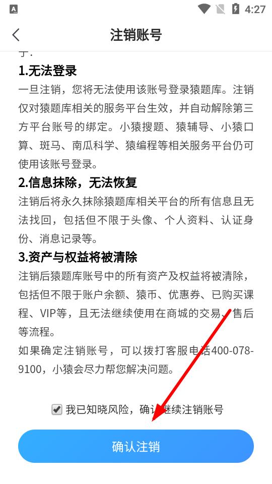 5、在页面仔细阅读相关提示及风险说明后,勾选我已知晓风险,确认继续注销账号,再点击确认注销,即可申请注销猿题库账号。