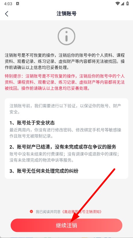 5、在注销账号说明页面,勾选后,点击继续注销按钮,即可进行后续注销操作。