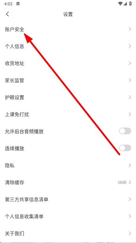 3、在设置页面,点击账户安全选项,进入账户与安全页面。
