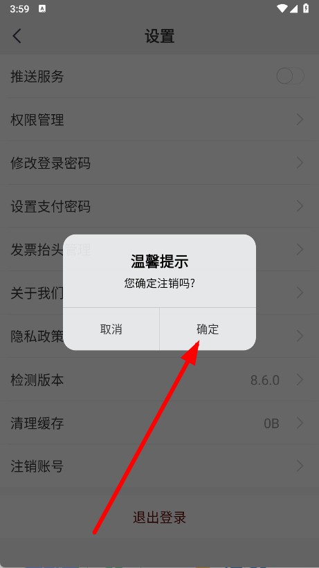 4、在温馨提示弹窗中,点击确定按钮,即可完成账号注销。