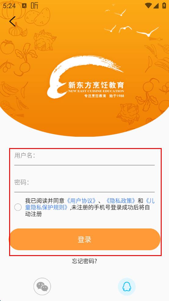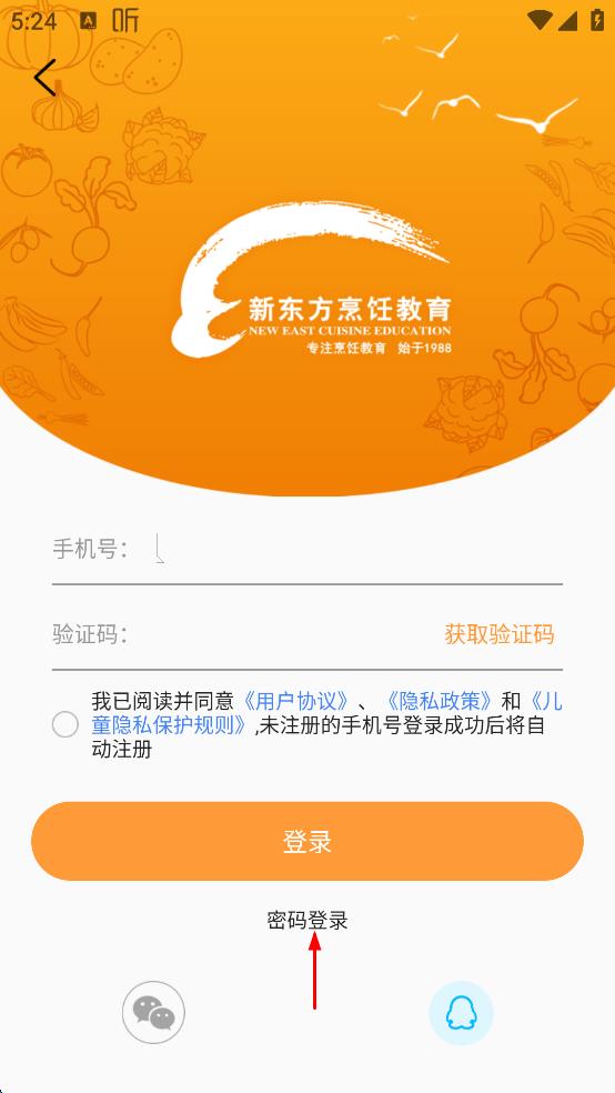 4、在密码登录界面,输入框中输入自己的用户名,再输入密码,勾选同意协议,最后点击“登录”按钮,即可尝试登录新东方烹饪教育APP。
