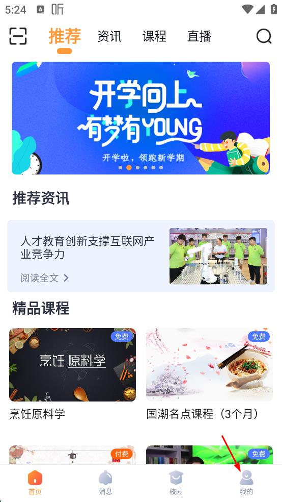1、打开新东方烹饪教育APP,进入首页后,点击页面右下角“我的”选项,进入个人页面。