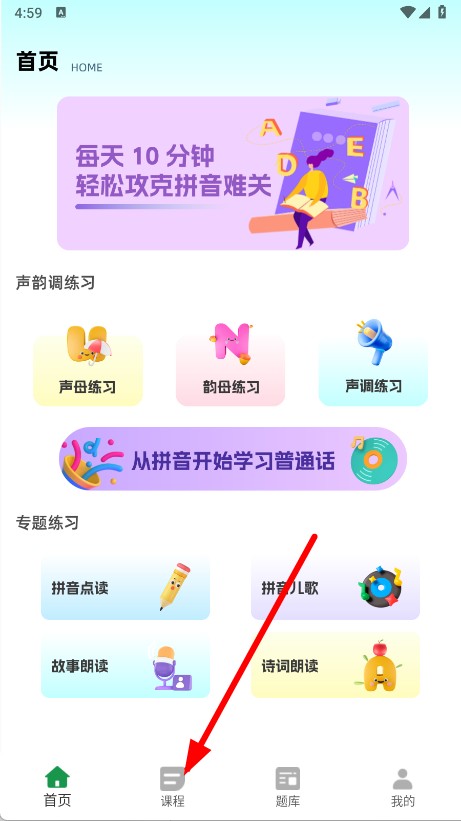 1、打开言鸟普通话APP,点击底部课程选项,进入课程页面。