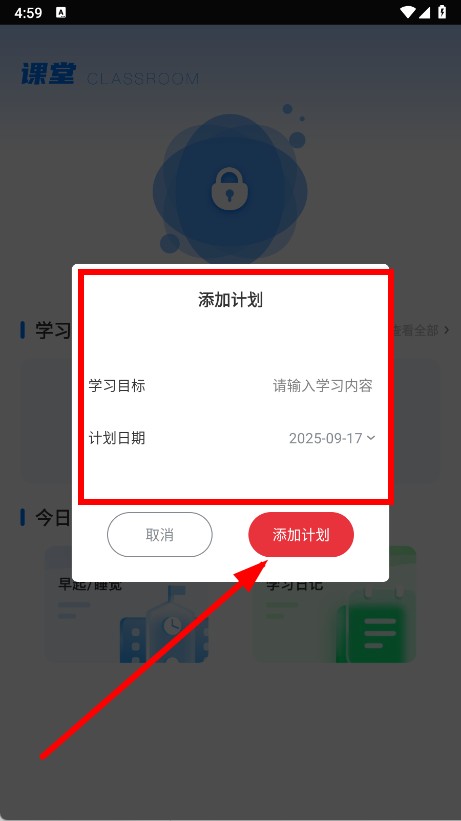 4、输入学习目标,选择计划日期,点击添加计划按钮,完成学习计划的添加。
