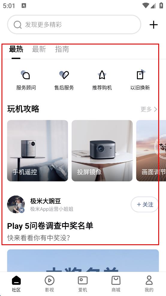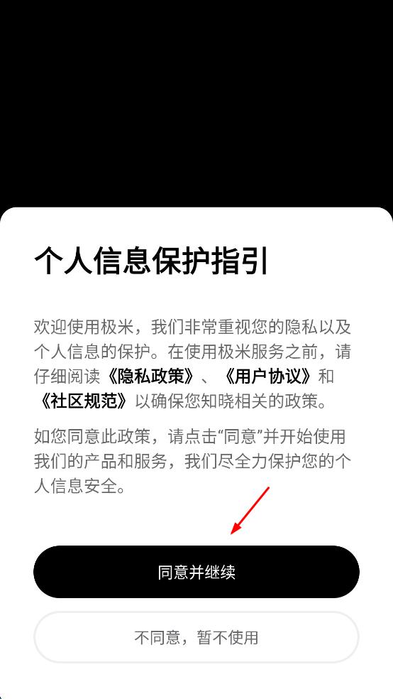 1、打开极米APP,会看到“个人信息保护指引”提示框,认真阅读隐私政策,用户协议和社区规范后,若同意相关内容,点击“同意并继续”,进入主界面。