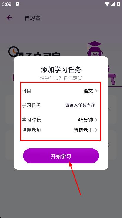 3、设置科目、学习任务等信息后,点击开始学习,进入专注学习页面。