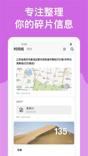 提供便签、清单、图片、倒数日、纪念日、心情、链接、地址等14种类型
