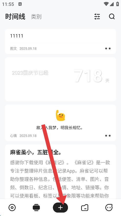 1、打开麻雀记APP,进入主界面,点击底部导航栏中间的+号按钮。