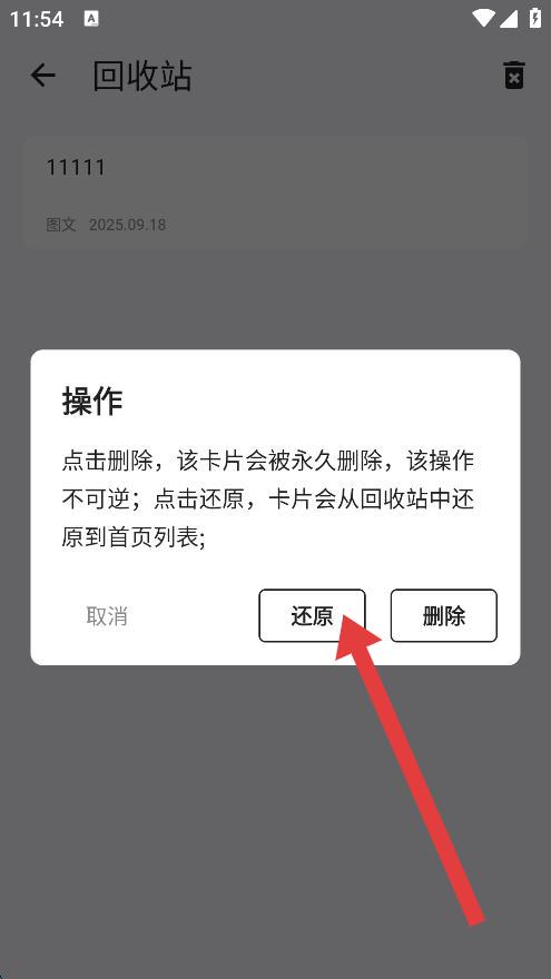 4、点击笔记后,会弹出操作提示框,点击其中的还原按钮,即可恢复内容。