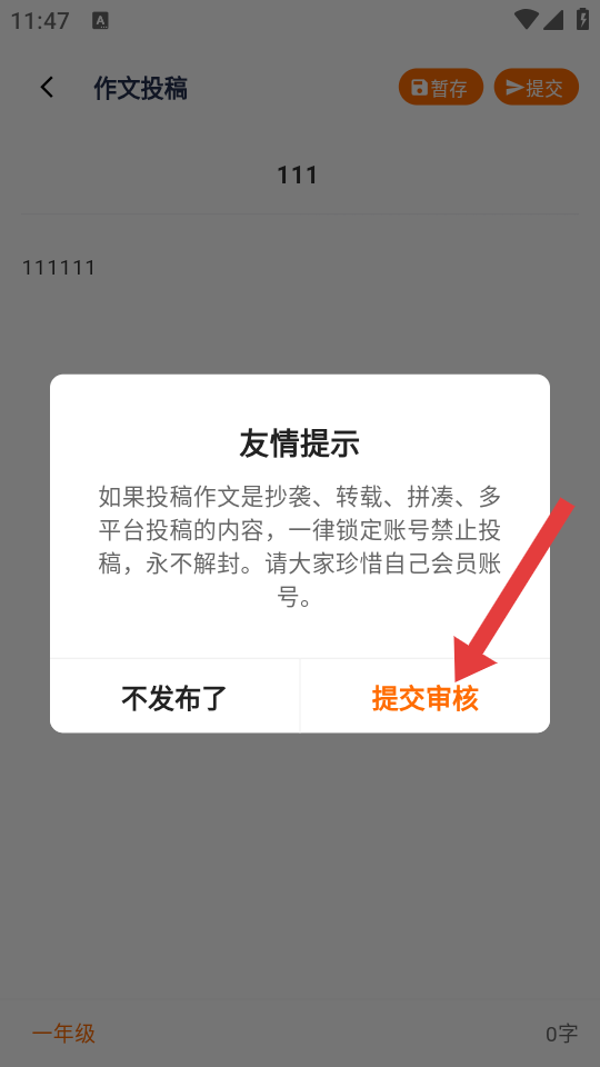 4、在弹出的友情提示框中,点击提交审核,完成作文投稿操作。