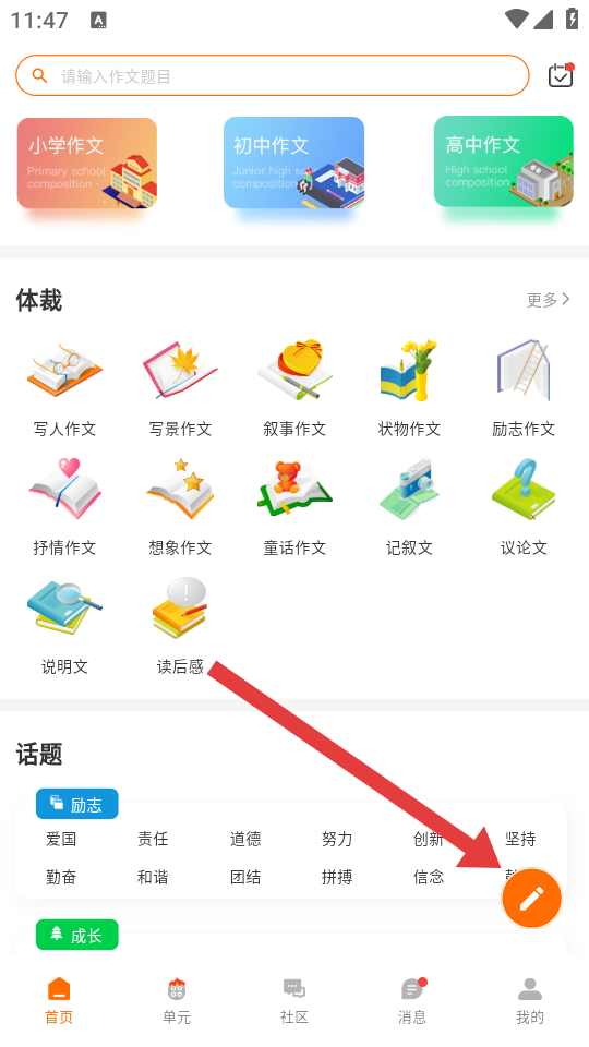 1、在作文吧APP首页,点击右下角带笔图标的按钮,进入作文投稿页面。