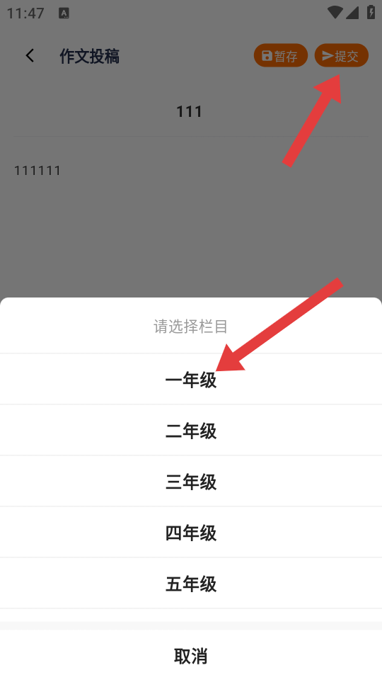 3、在弹出的年级选择列表里选好对应年级,再点击右上角提交按钮。