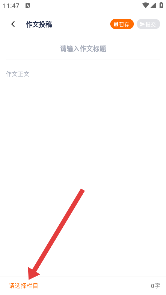 2、在作文投稿页面输入作文标题与正文后,点击左下角请选择栏目。