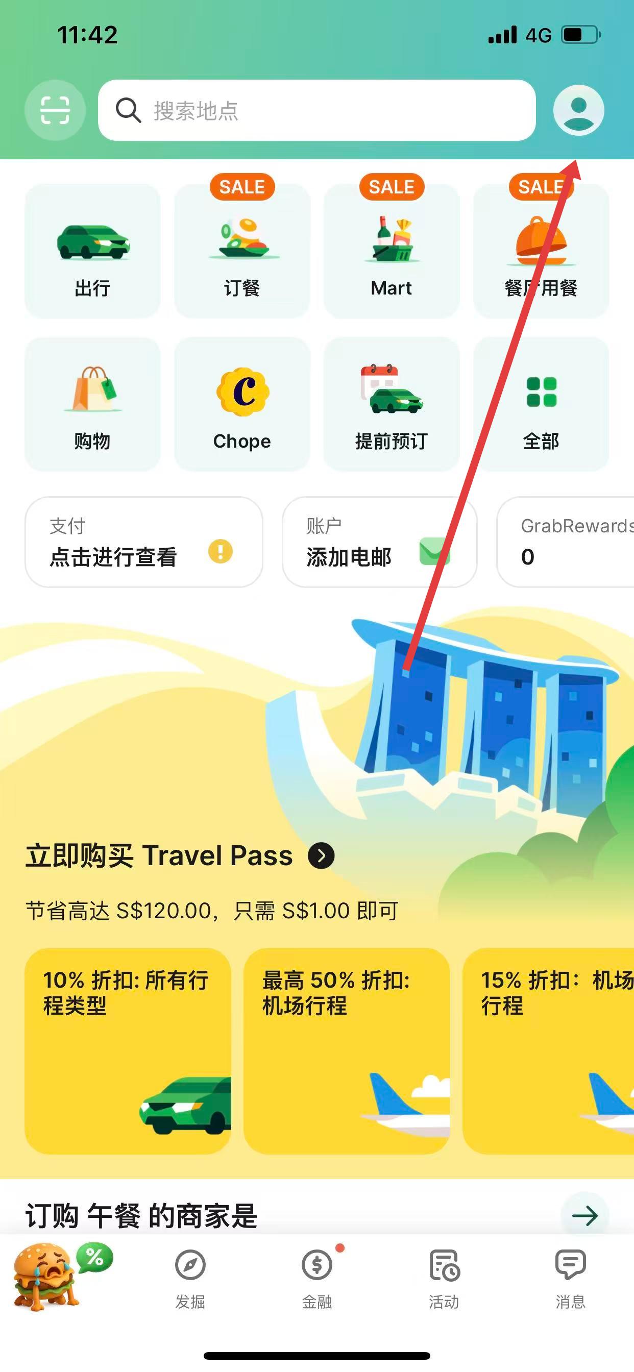 1、打开Grab应用程序,点击主界面右上角的头像。