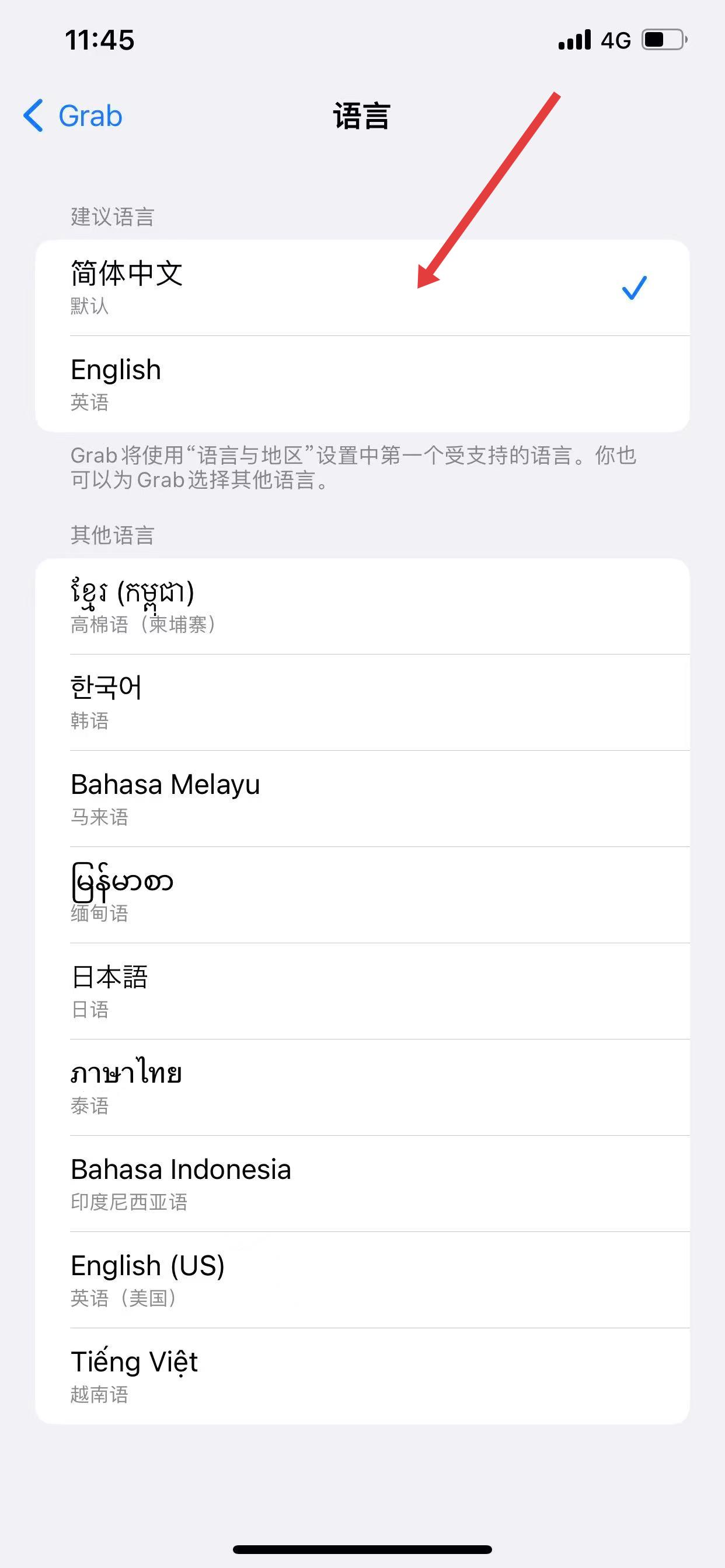 4、查找并选择简体中文,确认更改,应用界面将自动更新为中文显示。