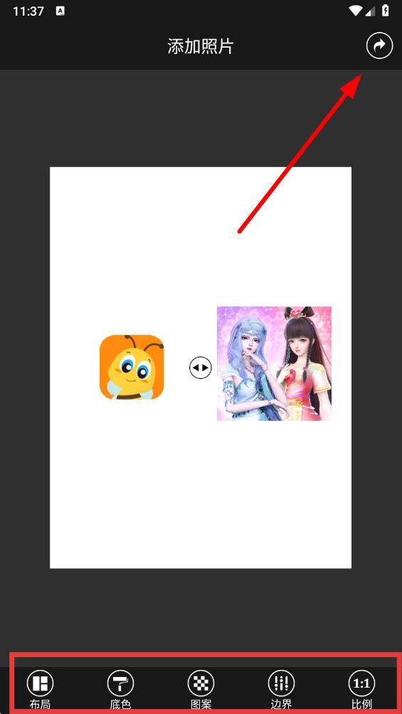 4、照片添加完成后,利用底部功能栏调整底色、图案、边界等,完成后点击分享图标旁的下一步。