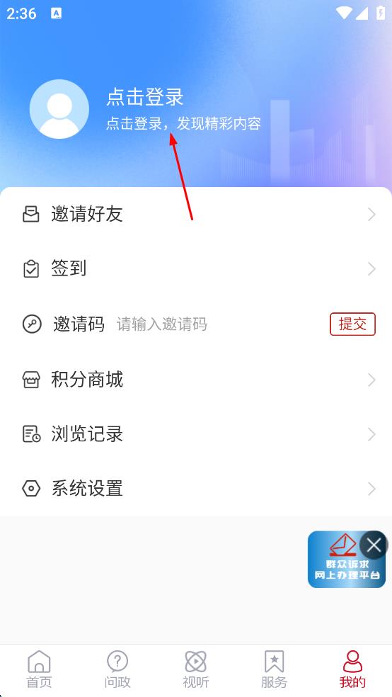 2、在个人中心页面,能看到点击登录的提示,点击该提示区域,进入到用户登录页面。