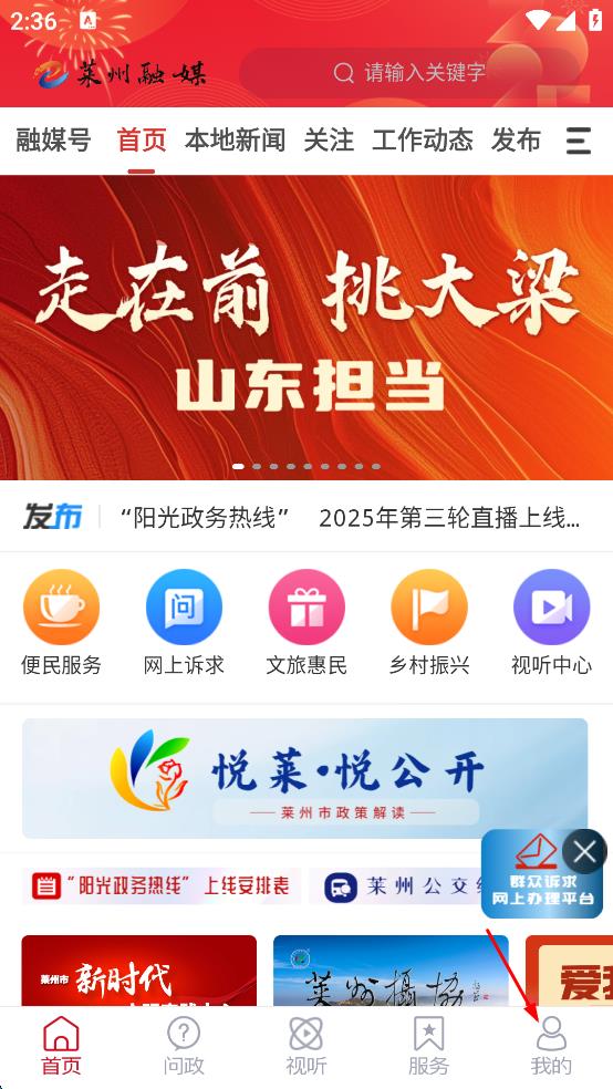 1、打开莱州融媒APP,进入首页后,能看到各类新闻资讯和功能入口,点击页面右下角“我的”选项,进入个人中心页面。
