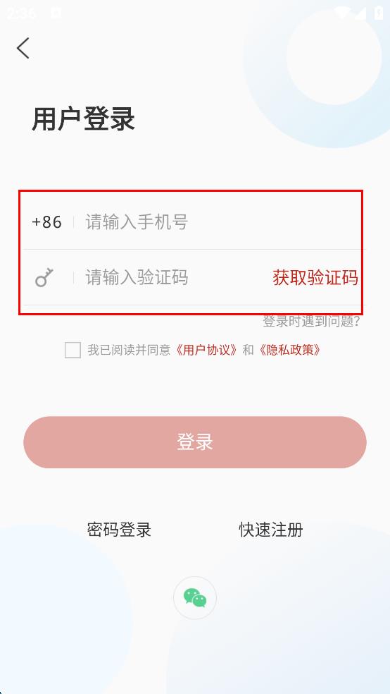 3、在用户登录页面,首先在对应的输入框中输入手机号码,然后点击获取验证码,将收到的验证码输入到验证码输入框中。