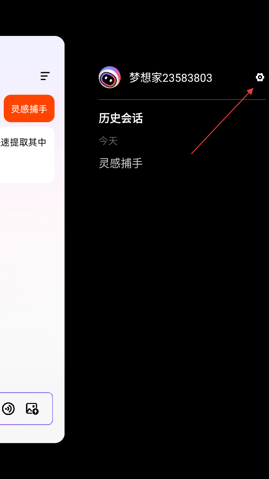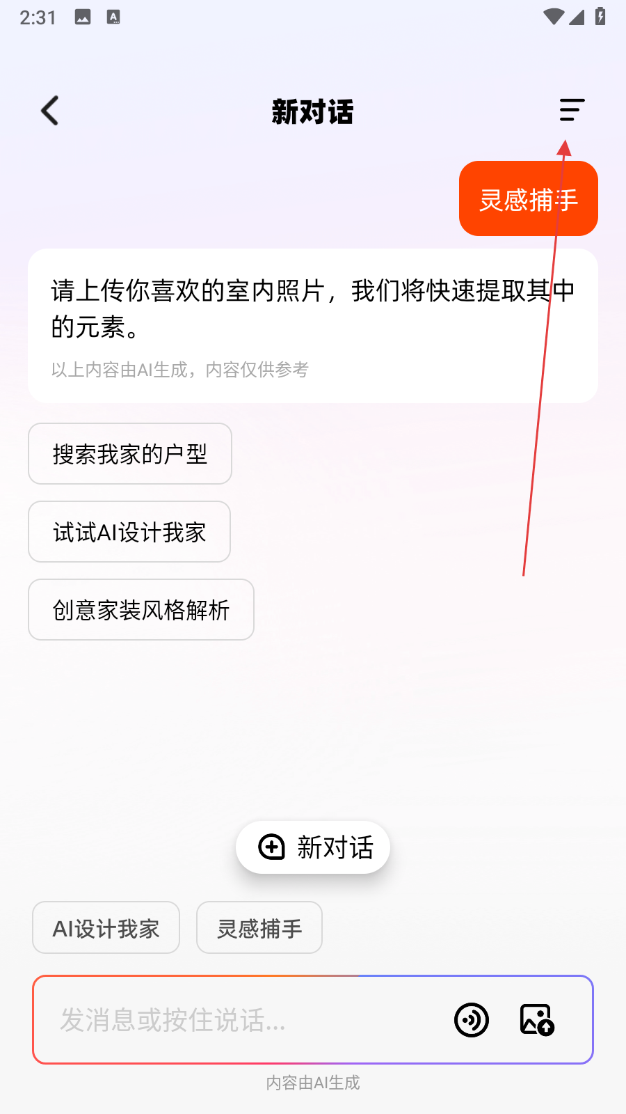 1、打开AI设计家APP,进入新对话界面,点击右上角三条横线图标展开侧边栏。
