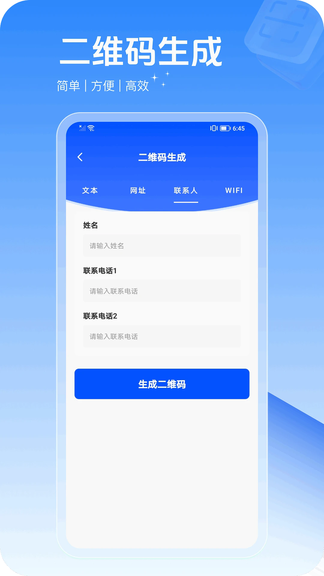 2、在首页点击生成联系人,这里输入文本,就能快速生成想要的二维码。