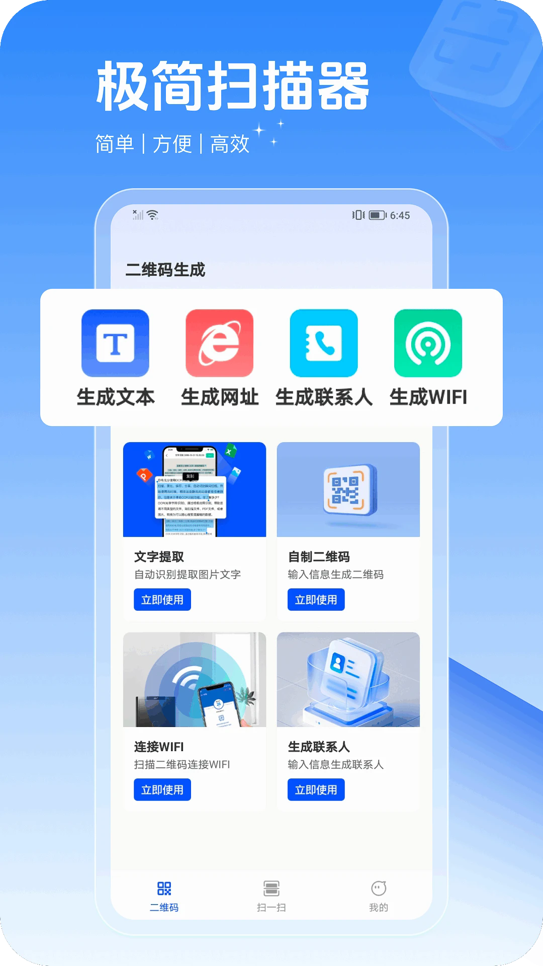 1、打开软件进入首页,会看到二维码生成、全能扫描工具功能模块,多种功能随时用。