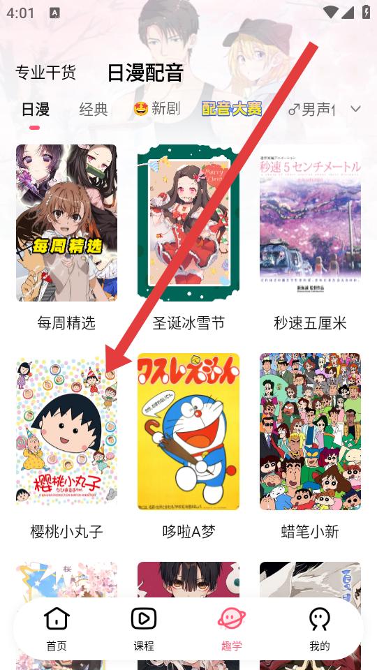 2、在趣学页面的日漫配音板块,选择要进行配音的日漫作品。