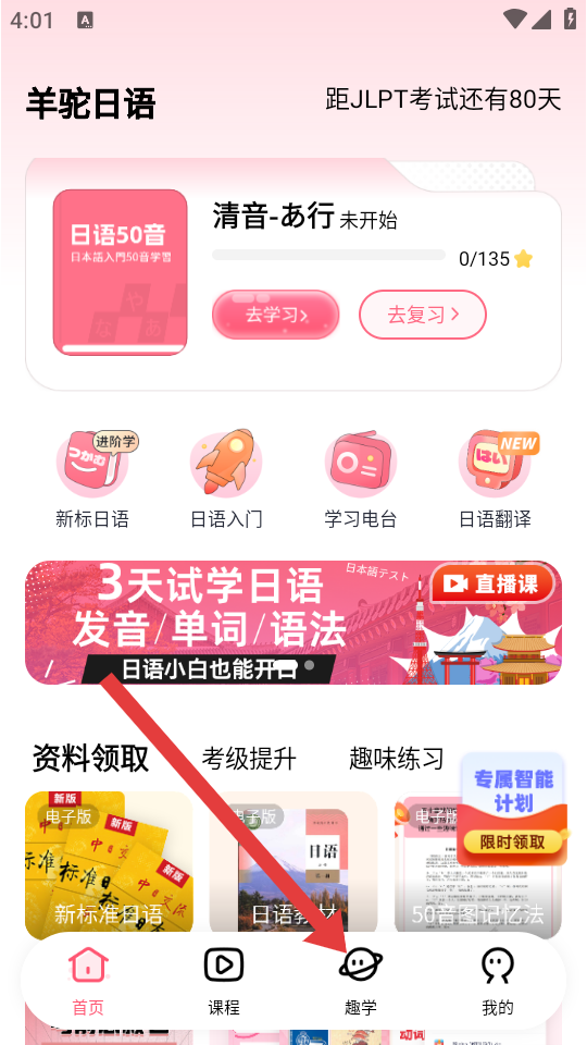 1、打开羊驼日语APP首页,点击底部趣学,进入趣味学习页面。
