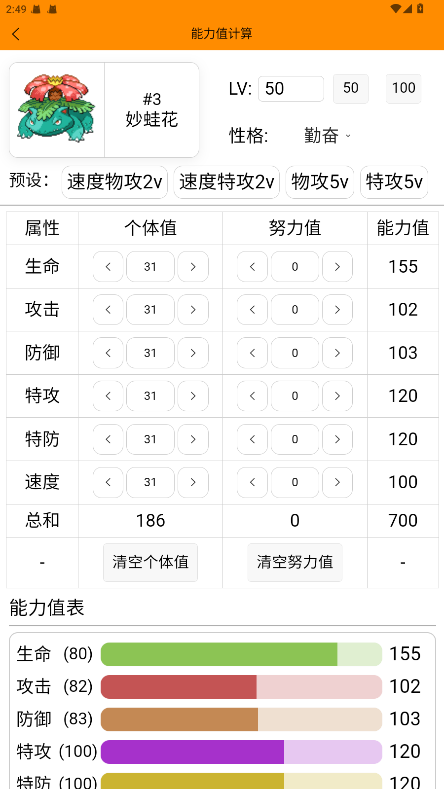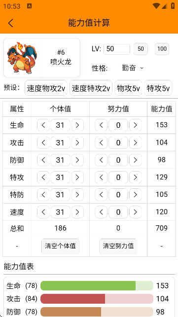 4、计算50级能力值:进入“工具”板块,打开“能力值计算器”,选择等级“50”,输入喷火龙的性格(如“勤奋”)、个体值(假设满个体31)、努力值(假设0努力),点击计算,即可生成HP195、攻击140、防御140等各项能力值及总和;