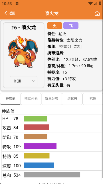 3、查看基础信息:确认其种族值总和534、特性“猛火”、隐藏特性“太阳之力”、野生分布区域及捕捉度15,了解其进化路线为“小火龙→火恐龙→喷火龙”;