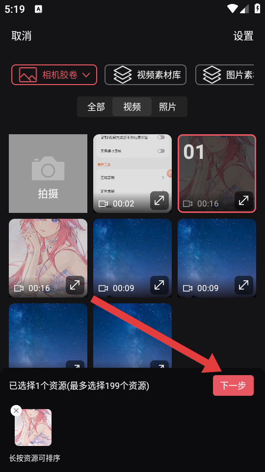 2、在视频素材选择界面,选取要创作的视频素材,选好后点击下一步。