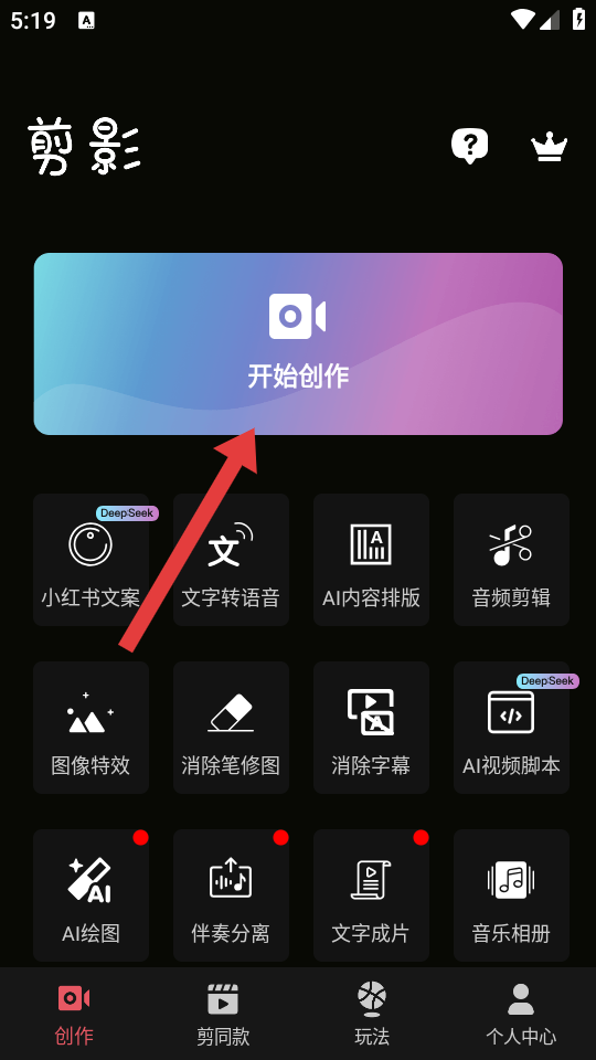 1、打开剪影APP创作页面,点击开始创作,进入视频素材选择界面。