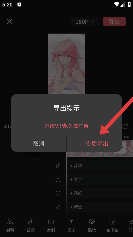 4、在弹出的导出提示框中,点击广告后导出,即可完成视频创作与导出。