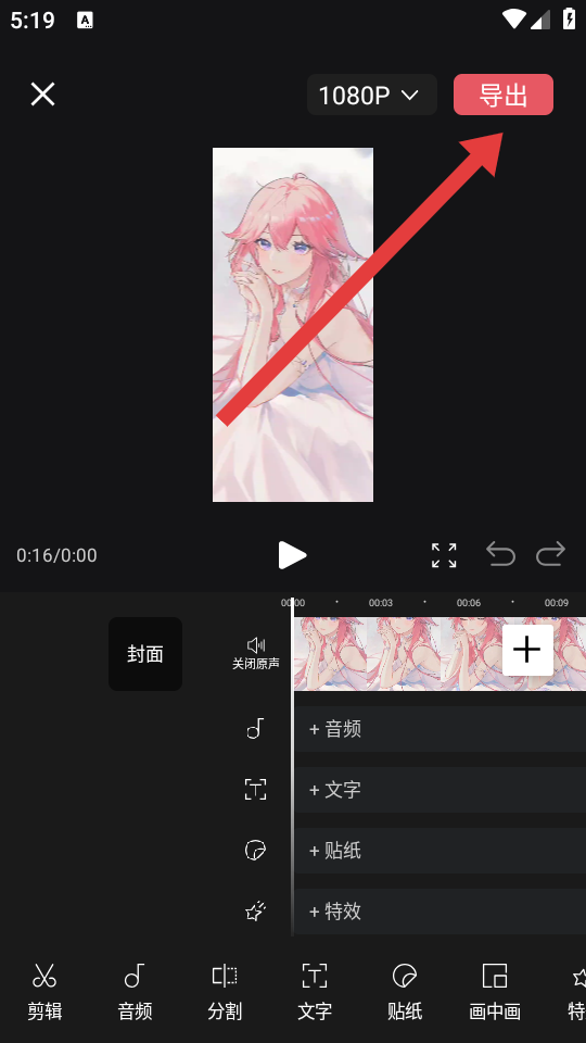 3、在视频编辑界面,可对视频进行剪辑等操作,完成编辑后点击右上角导出。