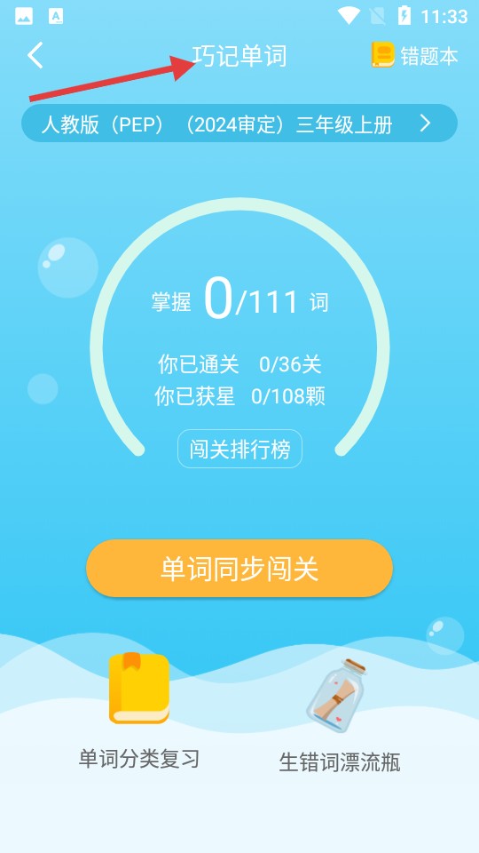 3、巧记单词页面,同样为人教版三年级上册内容,有单词同步闯关等功能,可查看掌握进度与闯关情况